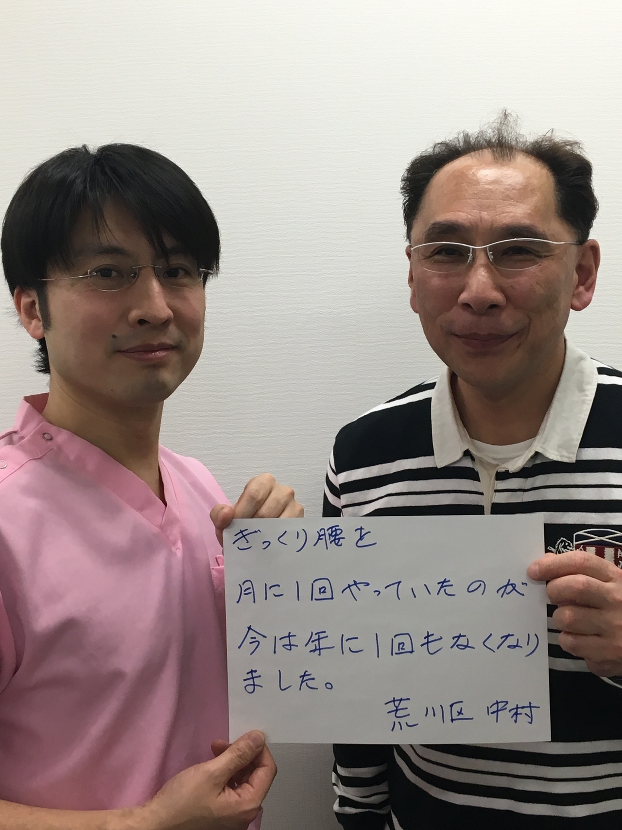 いつも笑顔でいられるほど良くなって、本当に良かったです。これからも毎日笑顔でいられるよう、空いた時間にお伝えしたストレッチ等を続けていってくださいね。