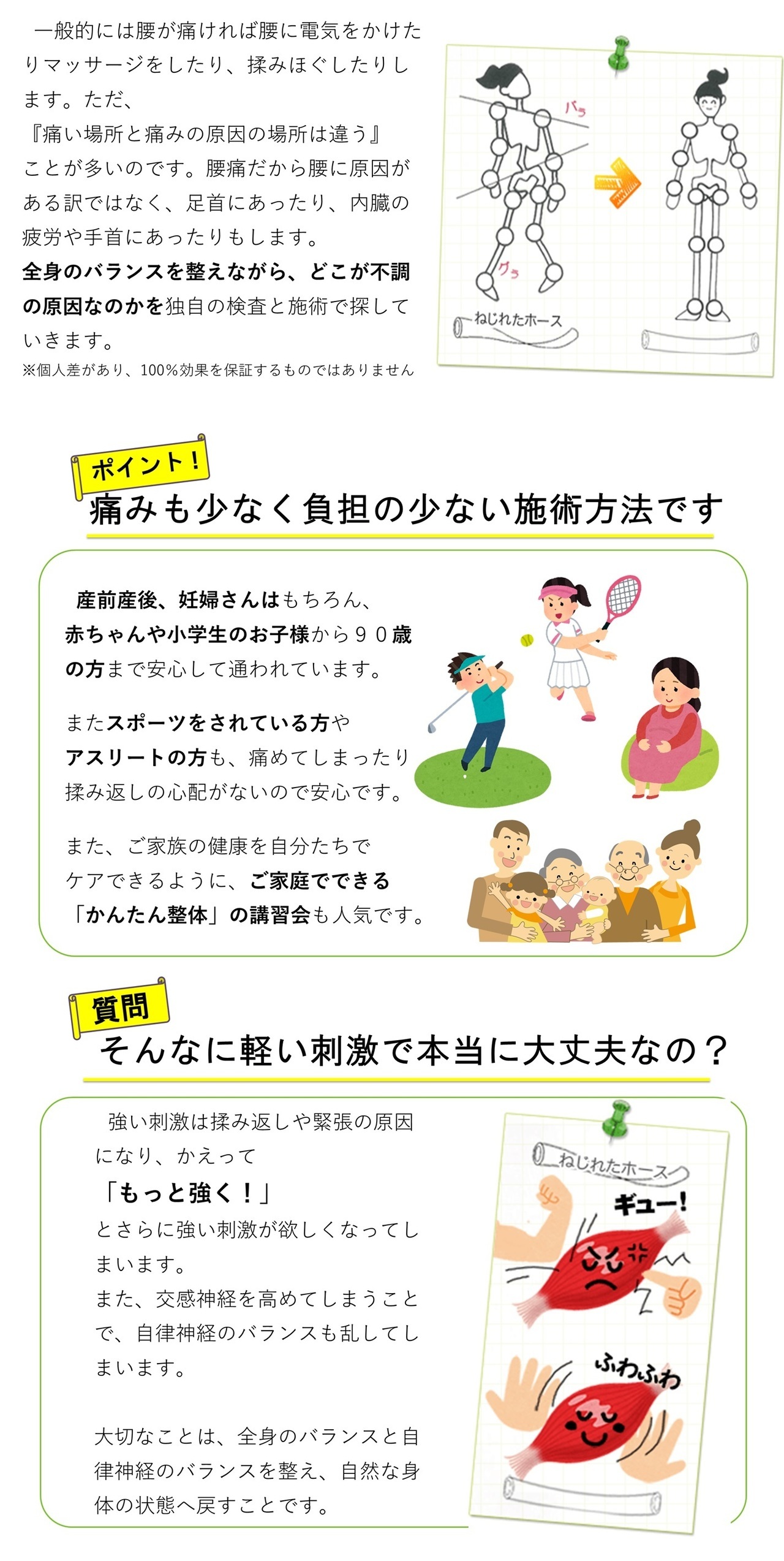 なんとか時間が掛かりながらも、日曜日にやっている整骨院を調べてやってきました。今まで通った整体院と全く違う治療を受け、それを受けるごとに腰が軽くなっていき、たった一回で動きが楽になりました。